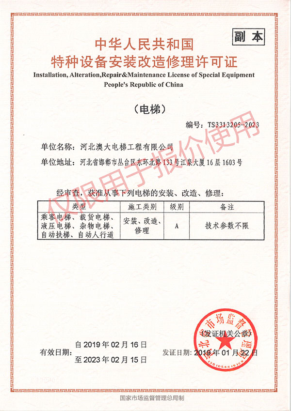 河北澳大電梯工程有限公司是集電梯銷售、安裝、維護(hù)保養(yǎng)為一體的專業(yè)化電梯公司。公司具有國(guó)家質(zhì)量監(jiān)督檢驗(yàn)總局頒發(fā)的“電梯安裝改造維修A級(jí)”資質(zhì)許可證。下設(shè)市場(chǎng)部、工程部、維保部、技術(shù)部、行政部及電梯配件公司。